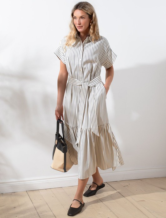 Состав: 65%Хлопок 20%Вис 15%ПЭ Плотность: 112 Г/м2Платье А-силуэта с поясом молочного цвета в тоную синюю вертикальную полоску выполнено из легкого хлопкового поплина плотностью 112 Г/м2. Воздушное платье с застежкой на пуговицы с пышной юбкой-воланом отличный вариант для теплой и жаркой погоды. Модель обладает красивым кроем, который придает образу женственность и элегантность. Отложной воротничок и короткий цельнокроеный рукав с широкой манжетой создают стильный акцент, подходящий для повседневного ношения и различных ситуаций. Талия подчеркнута поясом, который легко регулируется и подчеркивает силуэт, придавая особый шарм и аккуратность образу. Натуральный состав ткани обладает высокой воздухопроницаемостью, а также способностью поглощать и отдавать влагу. В повседневном платье будет очень комфортно, благодаря правильной регуляции температуры тела. Такая модель подходит на маленький и высокий рост, а так же на любую фигуру, позволяя подчеркнуть достоинства и скрыть возможные недостатки, так же принт в тонкую вертикальную полоску визуально стройнит и вытягивает силуэт. Это длинное платье отлично подойдет тем, кто ценит удобство и утонченность в одежде из качественной вискозы и хлопка. Красивое легкое платье прекрасно подходит для динамичного рабочего дня, городских прогулок или торжественных мероприятий, его легко адаптировать под разные ситуации и стили.