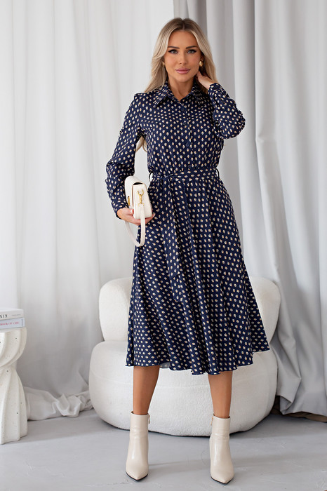 Красивое платье приталенного силуэта из легкой ткани - ниагара. Горловина оформлена отложным воротником на стойке. По переду выполнена планка с застежкой на петли и пуговицы. Длинный втачной рукав, оканчивается притачной манжетой. В боковых швах функциональные карманы. Модель отрезная по линии талии, присобрана на эластичную резинку. Тканевый пояс дополнительно акцентирует талию. Модель прекрасно дополнит ваш гардероб.
