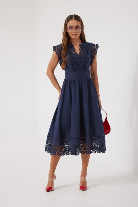 Платье выполнено из хлопкового полотна в сочетании с хлопковым кружевом, на подкладке по низу (50 см). Застежка на потайную тесьму-молнию в левом боковом шве. Платье отрезное по талии, по нижней части присборенно.