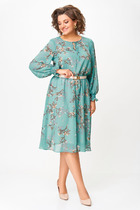 Платье женское полуприлегающего силуэта из трикотажа с декоративной вышивкой по рукавам. Перед с фигурными вытачками, выходящими из бёдер. Спинка со средним швом, заканчивающимся шлицей и с потайной молнией. Рукав втачной со сберкой по окату и низу с двойной манжетой. Длина платья по спинке - 101 см. Длина рукава - 61 см.