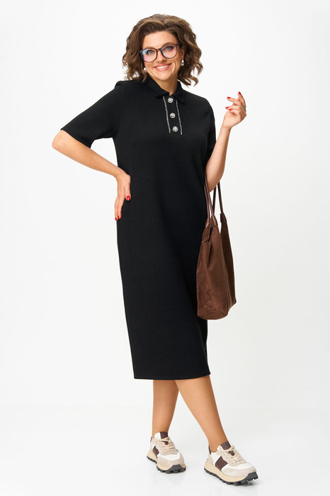 Платье женское полуприлегающего силуэта, зауженное к низу, длиной до середины голени. Перед с нагрудной вытачкой, выходящей из бокового шва, с планкой с отделочной лентой и кантом на 3 петли-пуговицы. Воротник отложной. Спинка цельная. Рукав втачной одношовный длиной до локтя.