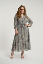 Платье полуприлегающего силуэта с естественной линией плеча.Спинка со средним швом и рельефами из проймы заканчивающимися складками.Перед рельефами из проймы заканчивающимися складками.Застежка центрально-бортовая на петли-пуговицы.Горловина V-образной формы.Рукав втачной одношовный длиной 3/4.По низу рукава выполнены вытачки.Низ рукава обработан обтачкой.