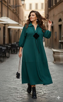 Представляем вашему вниманию элегантное платье миди в насыщенном чёрном оттенке, который актуален в любом сезоне. Выполненное из мягкой, струящейся ткани, оно обеспечивает приятные ощущения при носке и безупречную посадку. Свободный крой платья напоминающий собой форму «купола» слегка заужается к низу придает силуэту изящество и позволяет ему деликатно ниспадать по фигуре. V-образный вырез горловины, дополненный отложным воротником, придает платью классический и в то же время современный вид. Линия талии завышенная, лиф платья двойной, со средним швом. Рукав в платье цельнокроеный со сборкой на манжету, добавляют образу непринужденности и объема. Горизонтальный шов, расположенный примерно на уровне бедер, создает интересный структурный акцент. В боковых швах карманы. В качестве дополнительного декоративного элемента в комплекте с платьем идёт украшение ручной работы.  Длина платья 125 см., длина рукава 62,5 см (р 52-56), 64,5 см (р 58-62).