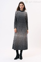 Это платье сотканное из тончайшего трикотажа с деликатной фактурной основой и тончайшей люрексовой ниткой. Полотно платья свободно ниспадает от плеч, даря свободу движения. Платье прямого силуэта с акцентной деталью в виде качели по переду платья, с заложенными складками по плечу. Линия плеча имеет ровную форму. Рукав втачной, длинный.