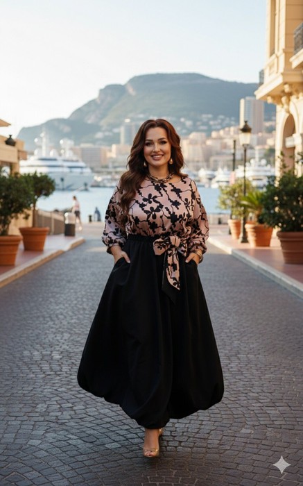 Невероятно красивое и элегантное платье отвечает всем требованиям вечернего наряда! Сочетание тканей разных фактур и дизайнов в одной модели - тренд сезона. Для лифа с мягкими присборенными рукавами мы выбрали пластичный атлас, а формоустойчивую тафту - для создания модной юбки «баллон». Сдержанный блеск атласа с деликатным принтом подчеркивает глубину тона черной тафты. Платье отрезное по талии, с круглой горловиной. Рукав длиной 7/8 со спущенной проймой и сборкой по низу на резинку. Длинная юбка «баллон» собирается по талии на эластичную ленту в отрезном поясе. По поясу платье декорировано бантом в виде съемной броши. Длина платья 129 см (р 48-52), 130 см (р 54-58). Длина рукава 31 см.