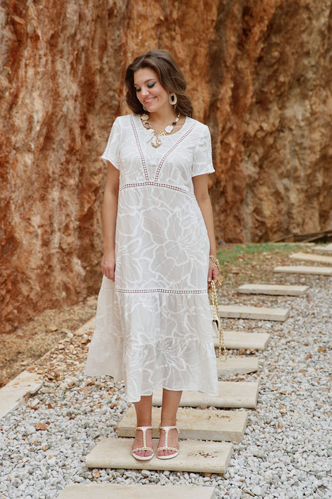 Каждая деталь этого платья пронизана нежностью и шармом. Платье позволяет каждой женщине, носившей его, ощущать себя неотразимой. Оно является идеальным выбором для летних встреч, прогулок по берегу моря или романтических свиданий в парке. Украсит любую фигурку, а вставки из кружева добавят образу романтики. Платье, расклешённое к низу, на подкладке. По переду расположены конструктивные вытачки и фигурная вставка с намёком на декольте на лифе с декоративным кружевом, округлый подрез на завышенной талии с кружевной тесьмой, в нижней части расположены удобные карманы, горизонтальный подрез с кружевной тесьмой и воланы. По спинке в верхней части расположен средний шов с обработанной застёжкой на навесную петлю с пуговицей, горизонтальные подрезы с кружевной тесьмой и воланы. Рукав втачной с вертикальной вставкой из кружевной тесьмы. Длина платья 130 см(р.50-54), 130,5 см (р.56-60). Длина рукава 21 см(р.50-54), 21,5 см (р.56-60).
