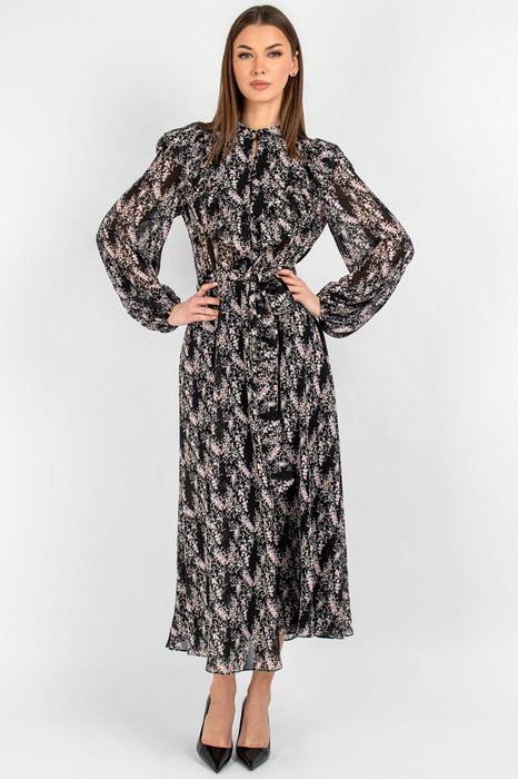Втачные одношовные рукава с изящной сборкой у оката и эластичными манжетами идеально сидят по фигуре, не стесняя движений. Воротник-стойка придаёт платью строгий, но женственный вид, а завязывающийся пояс позволяет регулировать объём талии, создавая желаемые пропорции.