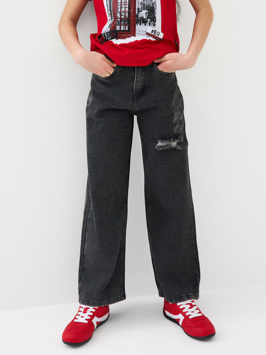 Джинсы для девочки подростка. Впереди застежка на молнию и болт. Внутри пояса — эластичная лента с пуговицами для регулировки. Модель wide leg из плотного черного денима с прямыми широкими штанинами. Посадка классическая по талии, длина — до щиколотки. Спереди два боковых кармана, сзади — два накладных кармана. Декорированы принтами и нашивками. На поясе сзади — брендированный ярлык.