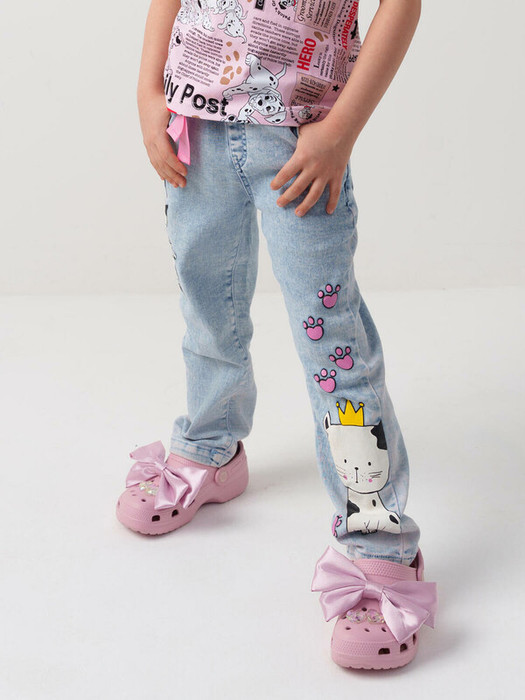 Стильные джинсы для девочки. Модель с зауженным кроем Slim fit и удобной средней посадкой. Пояс на резинке с розовой декоративной завязкой. Сзади — два кармана, один из которых украшен розовым принтом. На штанинах — яркий и милый принт с изображениями кошек и следами лапок. Вся отделка — в анималистичном стиле: пояс, карманы и низ брюк декорированы чёрно-белым принтом.