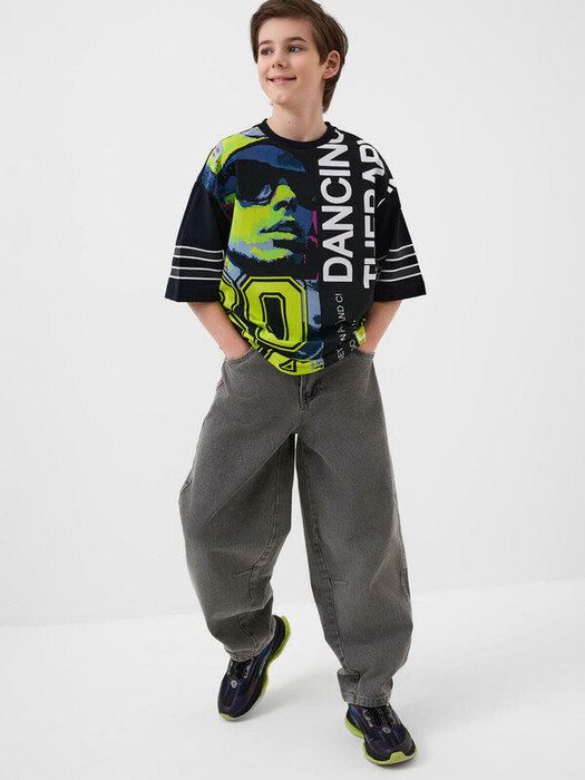 Джинсы для мальчика подростка. Модель прямого силуэта, свободной посадки со слегка укороченной длиной. Сзади пояс собран на резинку, что обеспечивает комфортную посадку. Джинсы выполнены из плотного светло-серого денима. Спереди расположены два классических кармана, сзади – два накладных кармана. Застежка на молнии и кнопку. На заднем кармане — декоративная нашивка с логотипом.