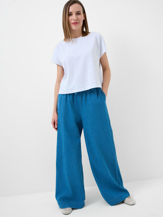Женские джинсы свободного кроя с высокой посадкой и прямыми широкими штанинами. Джинсы выполнены из голубого денима. Пояс на резинке со шнурком обеспечивает комфортную посадку и регулируется по объему.