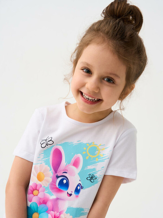 Детская футболка для девочки. Модель прямого кроя, выполнена из эластичного хлопкового трикотажа джерси. Спереди расположен крупный красочный принт. Горловина круглая.