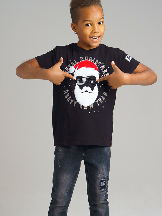 Футболка из качественного и приятного на ощупь трикотажа. Высокое содержание хлопка 95%. Благодаря наличию эластана в составе ткани изделие проще в уходе и держит форму. Новогодняя аппликация с реверсивными двусторонними пайетками и велюром. Горловина в эластичный рубчик.