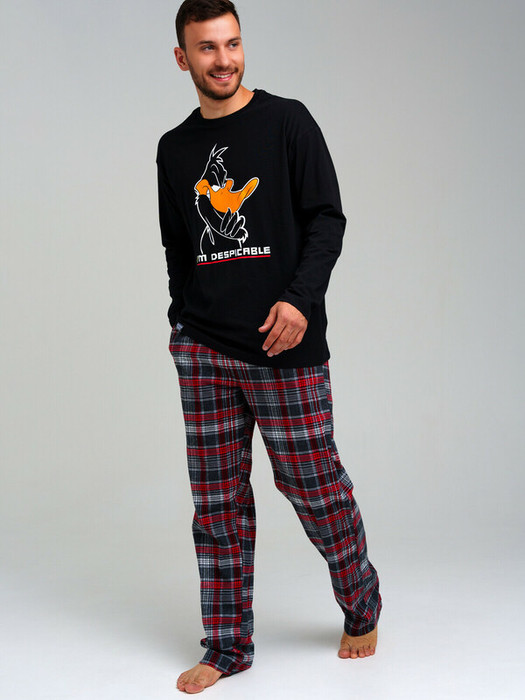 Мужская пижама. Лонгслив из качественного и приятного на ощупь трикотажа джерси с высоким содержанием хлопка 95%. Благодаря наличию эластана в составе ткани изделие проще в уходе и держит форму. Брюки - 100% хлопок. Фланель - мягкая, приятная к телу ткань с небольшим начесом. Эластичный пояс с тесьмой позволяет легко надевать брюки и утягивать до комфортной посадки.