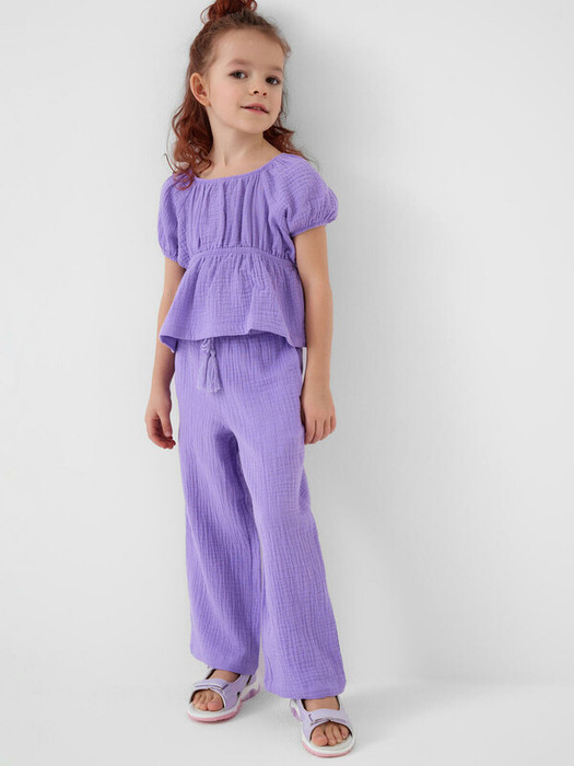 Легкий летний детский комплект для девочки. Состоит из укороченной блузки и широких брюк. Материал – мягкий хлопковый муслин, дышащий и приятный к телу. Блузка с пышными короткими рукавами и сборкой на резинке по талии, что создает аккуратную и женственную форму. Брюки – длинные и свободные, с высокой посадкой и резинкой на поясе. По бокам — удобные карманы.