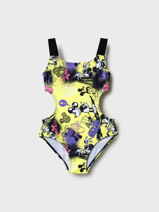 Слитный купальник для девочки подростка. Модель с оригинальным кроем: глубокие вырезы по бокам и открытая спина делают дизайн современным и стильным. Купальник украшен графичным принтом с изображением персонажа Mickey Mouse и разноцветными надписями. Внутри предусмотрена подкладка для большего комфорта. Все вырезы обработаны мягкой эластичной тесьмой для надежной посадки. Благодаря UF-защите, ткань сохраняет первоначальный вид даже при длительном пребывании на солнце. Отличный вариант для пляжа или бассейна.