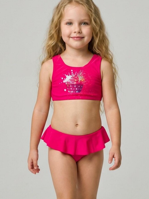 Детский раздельный купальник для девочки. Верх — это укороченный топ с широкими бретелями и с круглым вырезом горловины. На груди — крупный красочный принт. Плавки на подкладке дополнены широкой оборкой. Все края обработаны эластичной тесьмой, чтобы изделие хорошо сидело на теле и не натирало. Благодаря UF-защите, ткань сохраняет первоначальный вид даже при длительном пребывании на солнце. Подходит для плавания и активного отдыха.