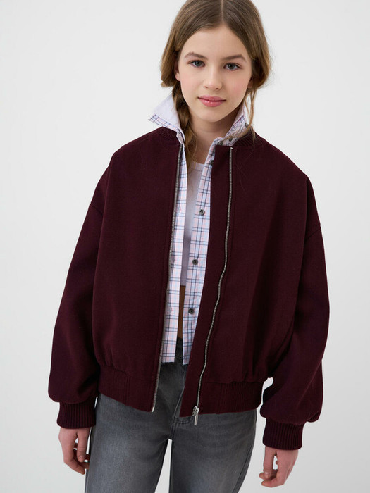 Бомбер оверсайз для девочки подростка. Температурный режим от +10 до +20С. Выполнен из плотной ворсистой ткани винного оттенка. Внутри гладкая подкладка. На воротнике, манжетах и по низу изделия  — широкая трикотажная резинка. Два боковых кармана. Внутренний карман на липучке. Изделие предназначено для весенне-осеннего сезона.