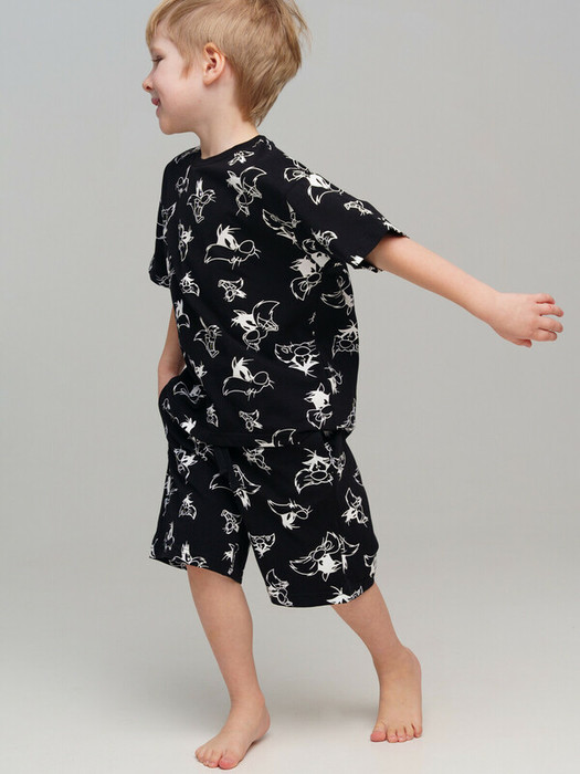 Пижама детская для мальчика. Футболка и шорты из эластичного и приятного на ощупь трикотажа. Шорты на резинке со шнурком.  Шорты с карманами в боковых швах. Высокое содержание хлопка 95%. Благодаря наличию эластана в составе ткани изделие держит форму и меньше мнется.