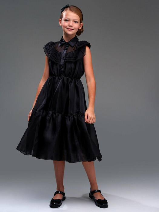 Нарядное платье для девочки подростка. Модное однотонное черное платье с воланами из органзы подойдет для торжественных мероприятий (день рождения, новый год, выпускной). Застежка на пуговицы-стразы.