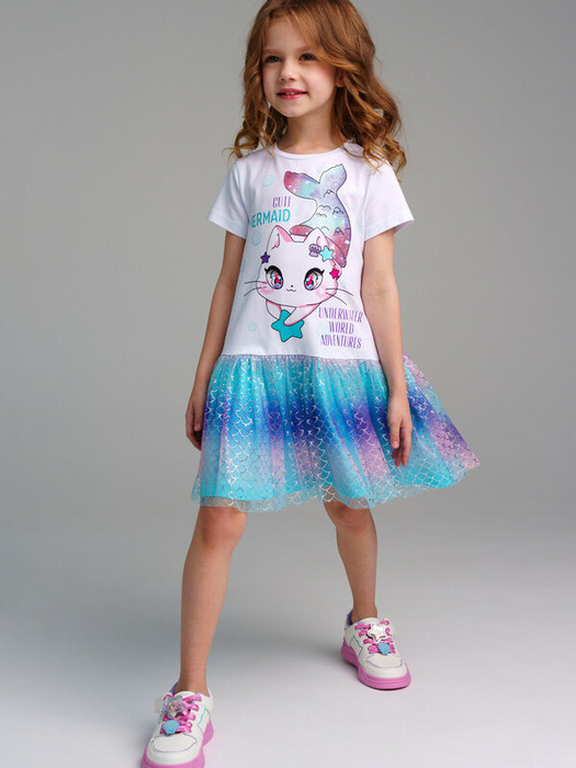 Платье трикотажное с юбкой из мягкой сетки. Верх платья из трикотажа с высоким содержанием хлопка 95%. Благодаря наличию 5% эластана в составе ткани изделие держит форму.