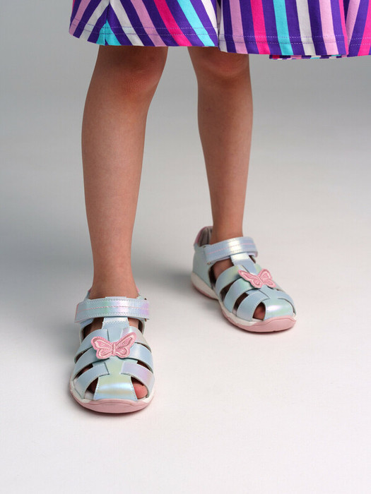 Сандалии из искусственной перламутровой кожи. Подкладка выполнены из натуральной кожи. Стелька из натуральной кожи с анатомическим элементом поддерживает свод стопы в правильном положении. Эргономичная форма колодки обеспечивает правильное формирование стопы ребенка. Формоустойчивый задник поддерживает стопу в правильном положении. Легкая подошва из терморезины обладает повышенной гибкостью и прочностью. Материал подошвы парфюмирован запахом жевательной резинки.