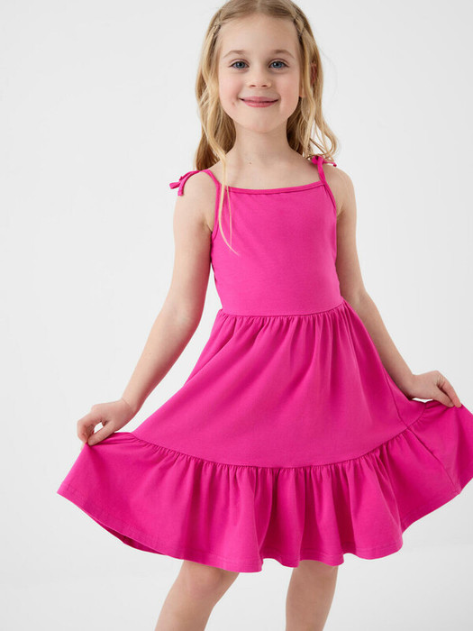 Лёгкий летний детский сарафан для девочки. Выполнен из мягкого хлопкового трикотажа джерси и имеет свободный крой и длину до колена. Узкие бретели завязываются на бантики на плечах. Юбка с лёгкими сборками придаёт объём и воздушность.