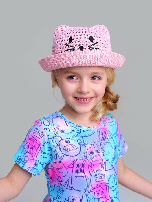 Шляпа детская для девочки. Дизайн мордочка кошки. Внутренняя регулировка размера по обхвату головы за счет атласных ленточек.