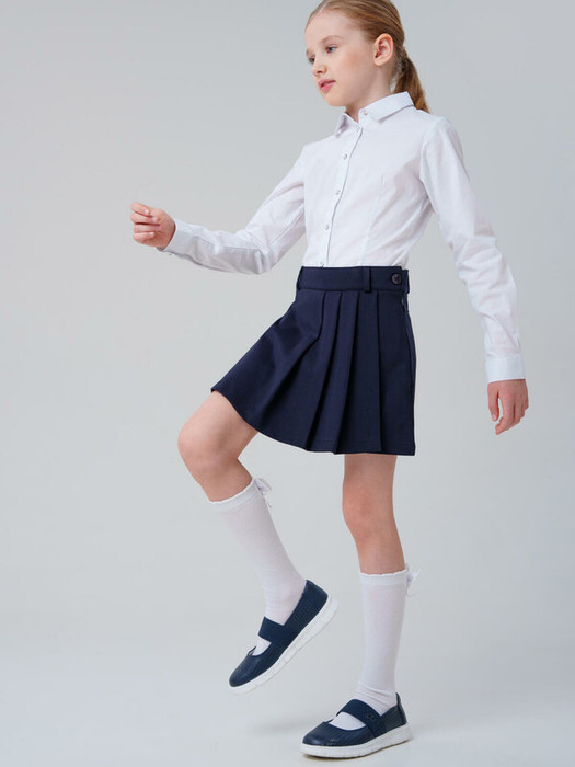 Трикотаж хорошо тянется, не натирает и не вызывает раздражения. Такая классическая школьная юбка-шорты для подростков сохраняет форму даже после множества стирок и легко сочетается с рубашками, водолазками, жилетами и жакетами из школьной коллекции бренда.