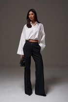 Брюки прямого кроя, на притачном поясе. Застежка - брючная тесьма-молния с обработанным гульфиком. В боковых участках пояса вставлена резинка для более комфортного прилегания. В брюках заутюжены канты. Длина брюк – 104 см.