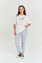 Брюки прямого силуэта большого объёма. Линия талии занижена. Пояс притачной. На передних половинках брюк карманы с отрезным бочком. На задних половинках брюк отрезная кокетка и накладные карманы.