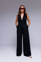 Стильный комбинезон полуприлегающего силуэта с расширенными книзу брюками из струящейся ткани. Комбинезон отрезной по линии талии на резинке, верхняя часть комбинезона на запах. По спинке в среднем шве центральная застежка на потайную молнию. В боковых швах карманы. Рукав цельнокроеный 5короткий на манжете. В комплект входит пояс из основной ткани.