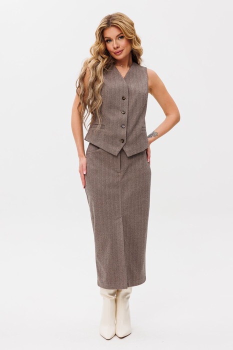 Юбка миди прямого силуэта на притачном поясе. По переду застежка на пуговицу и молнию. По бокам действующие карманы. По переду юбки шлица.