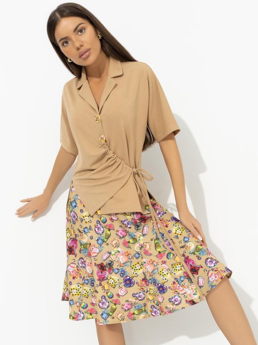 Недавно в столичном музее прошла первая в истории выставка, посвященная моде. Там были представлены культовые вещи, завоевавшие сердца модниц и звание произведения искусства. На экспозиции мог бы быть и костюм CHARUTTI, но увы, у нас не осталось экземпляров для выставки, все предназначены для вас. Комплект состоит из укороченного жакета ассиметричного кроя и расклешенной юбки. Пояс юбки на резинке. Жакет с лацканами. Есть разрезы по бокам изделия. Пуговицы жакета гармонируют с принтом юбки.