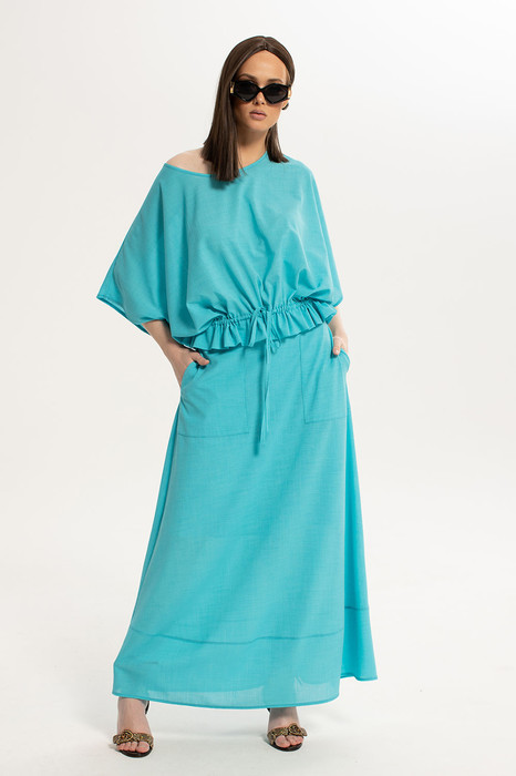 Комплект состоящий из блузы и юбки в модном бирюзовом цвете. Блуза выполнена в стиле пончо. По низу затягивается поясом. Юбка с накладными карманами. Пояс в юбке втачной, на молнии.