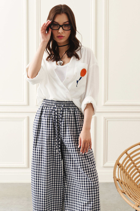 Комплект состоит из блузы и брюк. Блуза свободного кроя выполнена из легкой льняной ткани. Линия плеча спущена, рукав длинный, по низу рукава притачная манжета на застёжку петлю и пуговицу. Воротник рубашечного кроя, застёжка на петли и пуговицы. На правой половинке блузы расположен карман с вышивкой. По спинке кокетка. Брюки свободного кроя, прямые, выполнены из льняной ткани. По линии талии отрезной пояс на резинке и завязкой на шнурок. В боковых швах прорезные карманы.