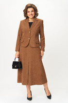 Элегантный комплект из блузы и брюк, выполненных из струящейся ткани средней плотности с атласным блеском. Блуза свободного кроя со слегка спущенным рукавом, дополненным притачной манжетой с застежкой на красивые пришивные пуговицы. Блуза дополнена притачным элементом, который драпируется вокруг горловины с помощью пришивных шлевок. По спинке застежка "капелька" на пришивную пуговицу. Брюки прямого кроя с притачным поясом, дополненным эластичной тесьмой. Застежка на потайную молнию и пуговицу. Длина блузы от плечевого шва 64см. Длина рукава 61см. Длина рукава 109см.