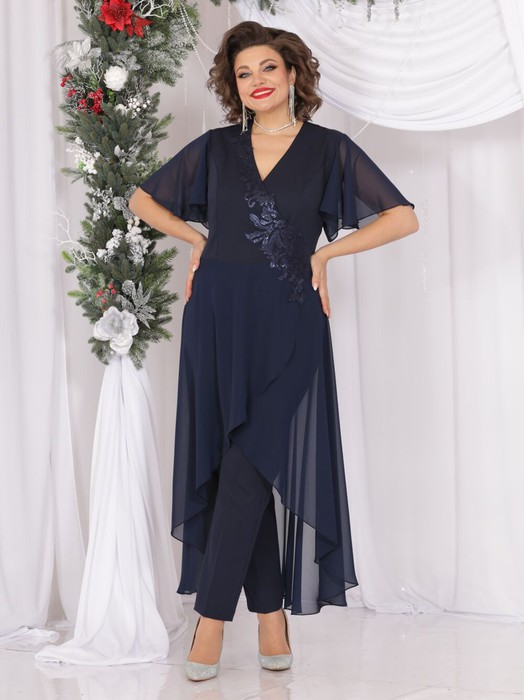 Нарядный комплект, соответствующий модным тенденциям, состоит из брюк-дудочек и оригинального платья, выполненный из эластичной однотонной ткани и шифона. Платье отрезное по линии талии, с роскошной притачной юбкой на запАх, с ассиметричной линией низа и расширенным рукавом. Лиф платья выполнен из основной ткани, по переду лиф с рельефами, V-образным вырезом и запАхом, декорированным аппликацией из кружева и бусинами. Спинка с талиевыми вытачками, со средним швом  и потайной застежкой-молнией в нем. Брюки с притачным поясом, по бокам которого вставлена эластичная тесьма (резинка). Застежка брюк классическая, по центру переда на брючную молнию и петлю, пуговицу на поясе. Роскошный наряд для уверенных в себе женщин!