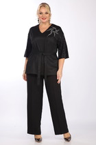 Блуза прямого силуэта, в боковых швах с разрезами, по переду с нагрудной вытачкой. Воротник стойка переходящий в бант. Рукав втачной одношовный, снизу на манжете. Сверху по окату со сборкой. Юбка прямая, зауженная к низу, на притачном поясе, по бокам с рисунком.