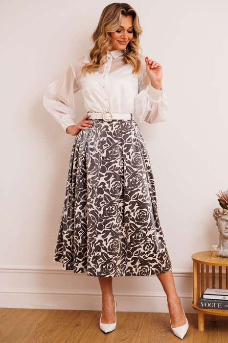 Образ, который впечатлит нас своим изяществом и неповторимостью. Блуза из невесомой вискозной органзы в тандеме с атласным топом и контрастной юбкой. Блуза прямого силуэта со спущенным плечом и рукавом на притачной манжете. Застежка центральная на петли-пуговицы. Воротник рубашечный. Низ рукава со складками. Топ прямого силуэта. Вырез горловины V-образной формы. Обработан подкройной обтачкой. В боковых швах разрезы. Юбка А-силуэта, по переду и спинке с односторонними складками. В боковых швах расположены карманы. Застежка на тесьму-молнию в среднем шве. Верх юбки на притачном поясе. Комплект дополнен ремнем, что позволяет регулировать ширину по линии талии. Добавив к блузе топ и юбку-карандаш, можно получить еще один дополнительный образ для офиса.