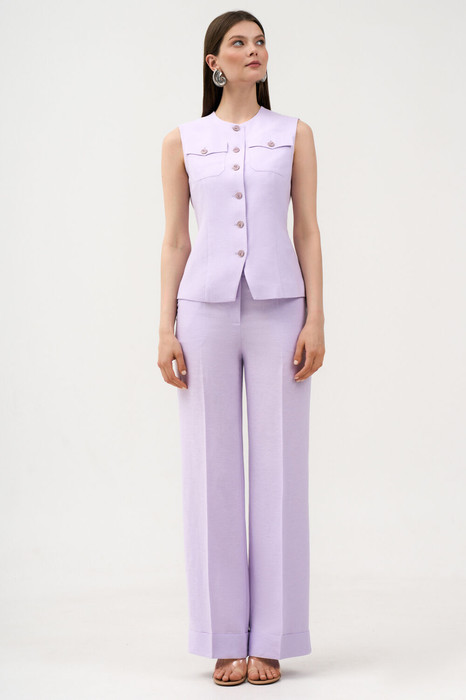 Брюки женские прямые со стрелками. По низу брюк выполнена имитация отложной широкой манжеты. Верхний край брюк обработан притачным поясом обтачкой. Брюки спереди застегиваются на тесьму-молнию и на поясе на петлю и пуговицу и пришивной крючок. В боковых швах обработаны карманы с наклонной линией входа. Средняя длина жилета по среднему шву спинки - 58,0 см (±3,0 см).