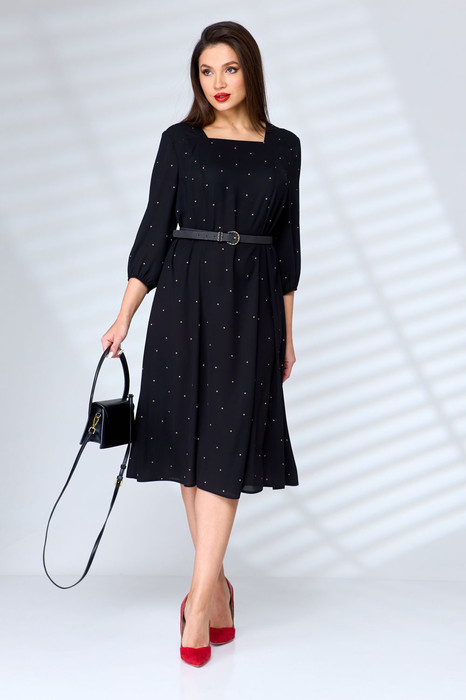 Элегантное женское платье из блузочной ткани в горошек прилегающего силуэта. От линии бедер платье раширяется к низу. Горловина П-образной формы, по верхней части кокетки. По полочке прилегание создается за счет рельефов, выходящих из подреза, по спинке - за счет среднего шова с молнией и рельефами. Рукав 3/4 длины , по низу резинка. В комплекте к платью идет съемный пояс. Длина платья:(50-54)-108 см, (56-60)- 113см, (62-64)-118см. Длина рукава (50-54)-46с.м, (56-60)-48см, (62-64)-50см.
