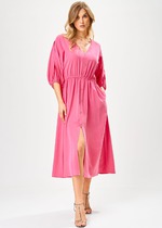 Платье женское полуприлегающего кроя, выполнено из шифоновой ткани. Изделие отрезное по линии талии, рукав втачной короткий, низ рукава обработан эластичной тесьмой. Горловина по лифу фигурная, По спинке платья имеется вставка из сетки и вырез "капелька". Платье на подкладке.