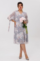 Платье без воротника , с V-образным вырезом горловины. Платье отрезное по линии талии. Полочки лифа переда располагаются на запах, с цельнокроенными завязками. Лиф спинки с талиевыми вытачками. Нижняя часть переда не закреплена к лифу, с центральной застежкой на петли и пуговицы. Шов по талии со стороны спинки присборен на резинку. Рукав втачной, короткий, с отрезной манжетой. Окат и шов притачивания манжеты присборен.