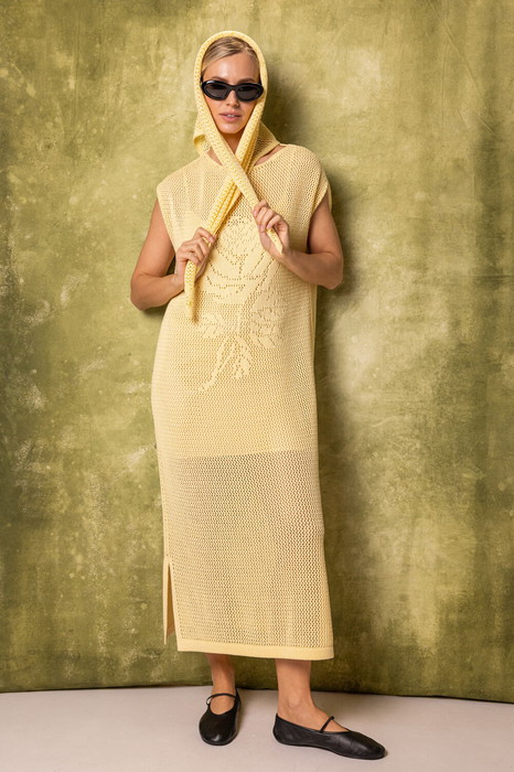 Нежное трикотажное платье прямого силуэта. Выполнено из смесовой хлопковой пряжи. Модель вывязана ажурным переплетением с флористическим рисунком — роза. Линия плеча мягкой формы, слегка спущена. Горловина округлая, обработана трикотажной бейкой. В комплекте нижнее платье — комбинация. Платье — прекрасный самостоятельный предмет гардероба.
