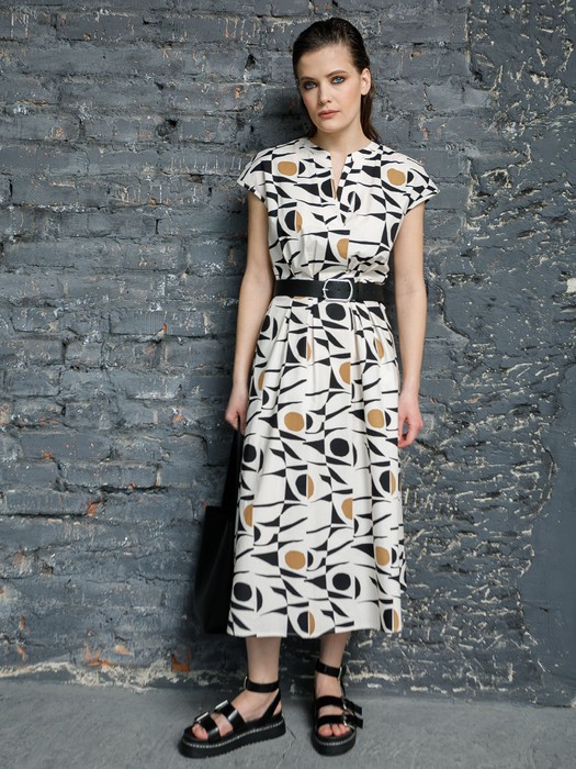 Модель Х-образного силуэта, со спущенным плечом. По талии застрочены складки. Вырез горловины и V-образный вырез сперереди подчёркнуты планками. В среднем шве спинки потайная застёжка молния. В боковых швах карманы. Пройма окантована. Ремень в комплект не входит.