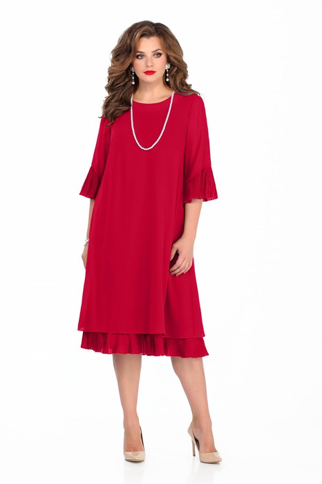 Платье трапециевидного силуэта с втачным рукавом. Спинка декорирована из плиссированной ткани. Рукав прямой. Низ рукава и низ платья оформлен рюшей из плиссированной ткани. Вырез горловины круглый на спинке декорирован завязывающем бантом. Платье выполнено на подкладке. Верх платья из текстиля. Подкладка трикотажная. Длина платья 113 см. Длина рукава 20 см.
