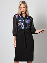 Платье полуприлегающего силуэта из тонкой летящей ткани. Рукав покроя реглан, из двух половинок внахлест. Талия на резинке, есть пояс. По лифу и юбке фиксированный запах, по низу юбки идет волан. Платье на подкладке, без застежки.