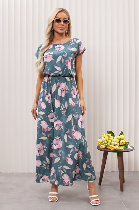 Воздушное платье полуприлегающего силуэта с цветочным принтом. Короткие спущенные рукава. Горловина на внутренней обтачке оформлена \"лодочкой\". Модель отрезная по талии, собрана на резинку. Низ ровный, без разрезов.