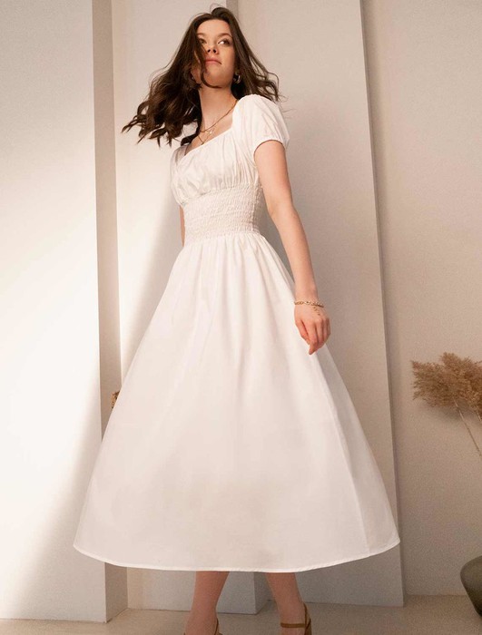 Платье-миди с объемными рукавами выполнено из премиального 100% хлопка-вуали. Модель с расклешенным подолом. Подкладка юбки выполнена из тончайшего хлопка. Завышенная талия на эластичной резинке подчеркивает женственность и нежность образа. Линию декольте можно регулировать за счет эластичного верхнего края, открывая плечи.